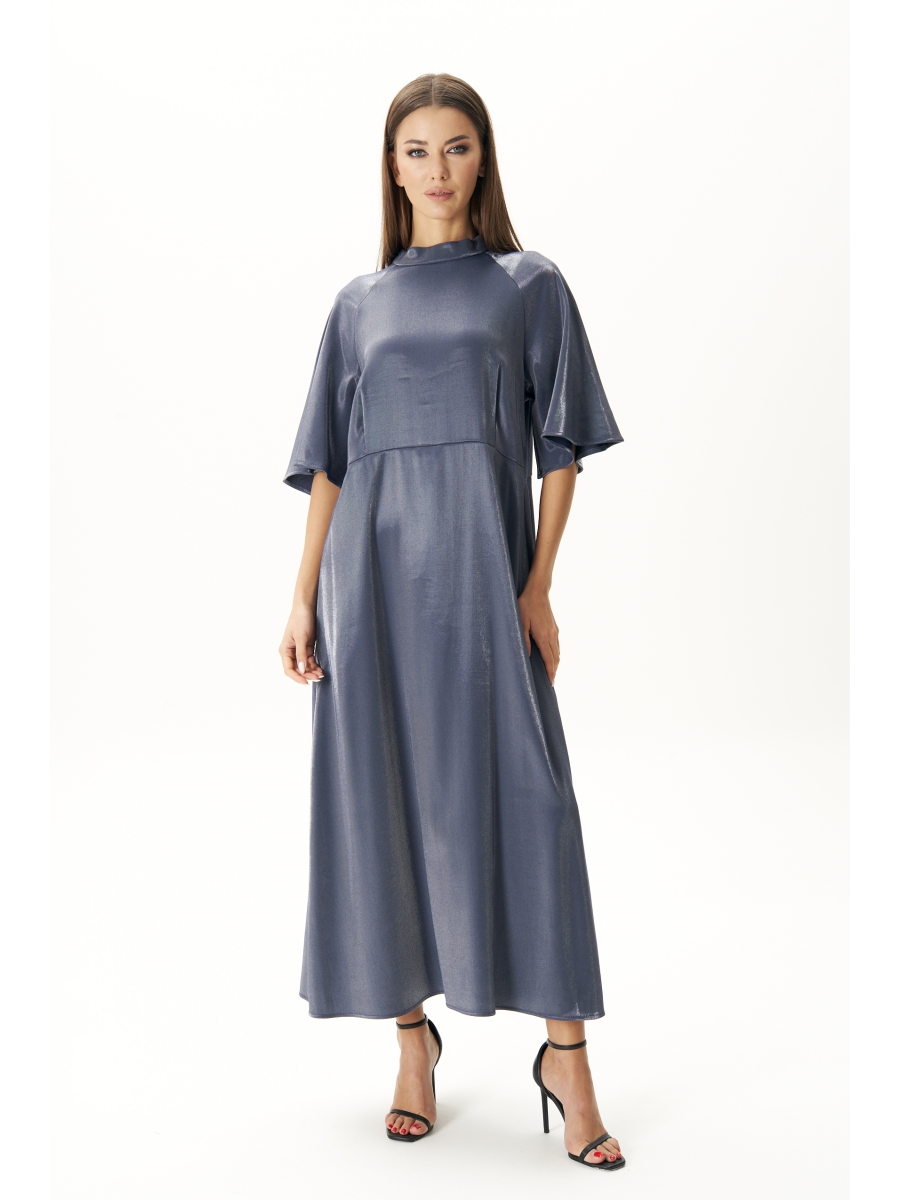 Платье покроя реглан с широкими акцентными рукавами длиной ниже линии локтя. Воротник - стойка на расширенной линии горловины, застёгивается сзади на пуговку-страз, образуя по центру спинки небольшой вырез треугольной формы.