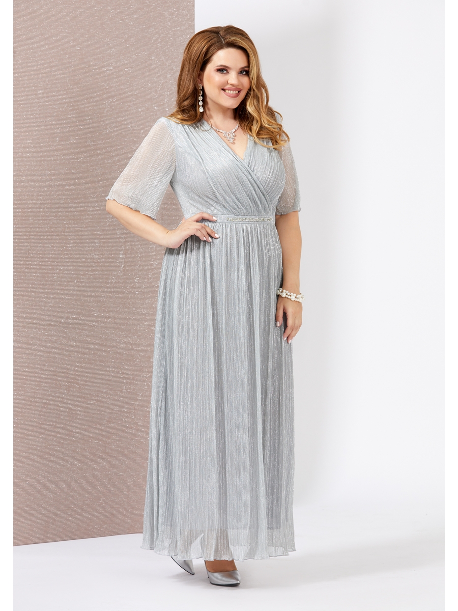 Элегантное вечернее платье выполнено из плиссированной ткани с блеском и атласа в качестве подкладки. Лиф платья на запах, с рельефами и с легкой сборкой от плечевых швов до талии. По переду втачной пояс, декорированный по центру. Рукав втачной до локтя. Юбка платья с легкой сборкой у линии талии. По лифу спинки талиевые вытачки. Потайная застежка-молния в боковом шве платья. Изящное платье, в котором Вы будете блистать на любом торжественном мероприятии!
