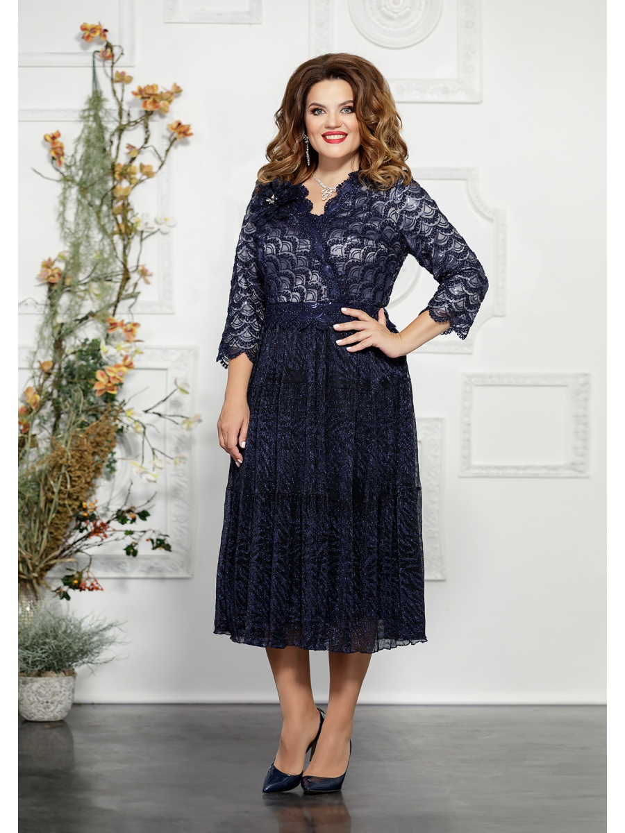 Нарядное, отрезное по линии талии платье с V-образным вырезом горловины и юбкой с воланами, расширяющимися к низу. Лиф платья выполнен из кружева, а юбка из легкой гофрированной ткани с люрексом, в качестве подкладки – атлас. Втачной рукав из кружева, длиной 3/4. По переду нагрудные вытачки, а по спинке талиевые. Потайная застежка-молния в боковом шве платья. Лиф платья скроен таким образом, что все линии визуально стройнят фигуру и делают талию тоньше. Платье дополнено брошью ручной работы. Это платье - отличный вариант для торжества!
