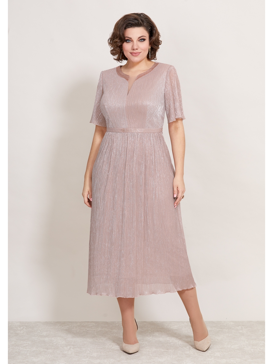 Эффектное женское платье, полу-прилегающего силуэта, выполнено из плиссированной ткани, на трикотажной подкладке. Лиф платья отрезной по линии талии, горловина округлой формы, на обтачке, также на горловине обработаны втачные планки из атласа в тон и декорированы стразами. По линии горловины выполнена вставка из сетки, что придает платье еще больше эффектности, по линии талии втачной пояс из основной ткани, декорирован стразами. Юбка присборена по линии талии и расклешена к низу, спинка отрезная по линии талии, со средним швом и вытачками. Рукав втачной, выполнен з основной ткани, укороченный. Стильное платье, то, что надо для торжественного мероприятия!