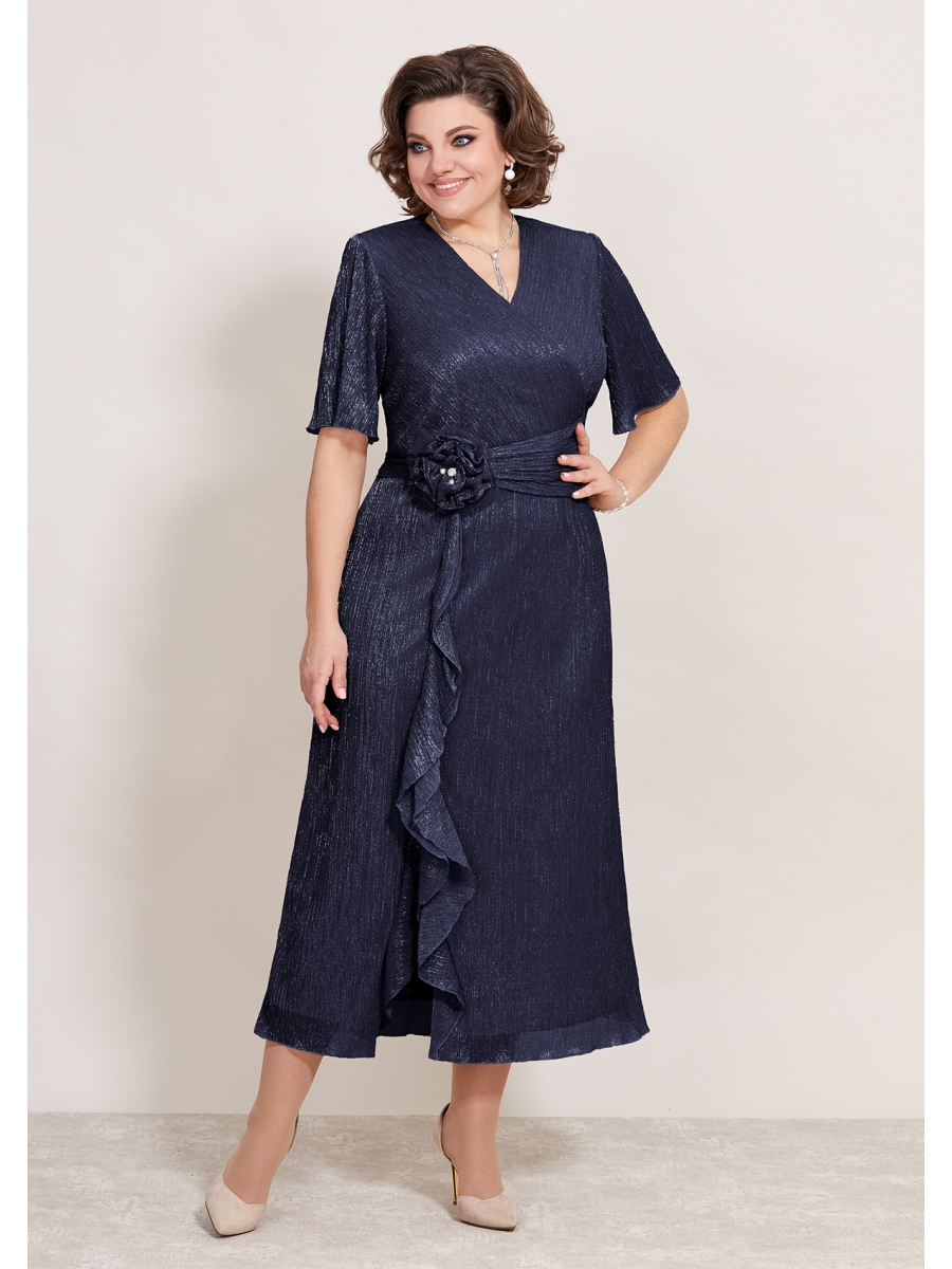 Нарядное женское платье полу-прилегающего силуэта, выполнено из плиссированной ткани, на трикотажной подкладке. Горловина V-образной формы, на обтачке, лиф платья отрезной по линии талии, с втачным поясом из основной ткани, декорирован съемным цветком. Юбка А-образного силуэта, на юбке выполнен вертикальный подрез, с разрезом по низу и вставками воланов из основной ткани. Спинка со средним швом и вытачками, рукав втачной, оптимальной длины, выполнен из основной ткани.