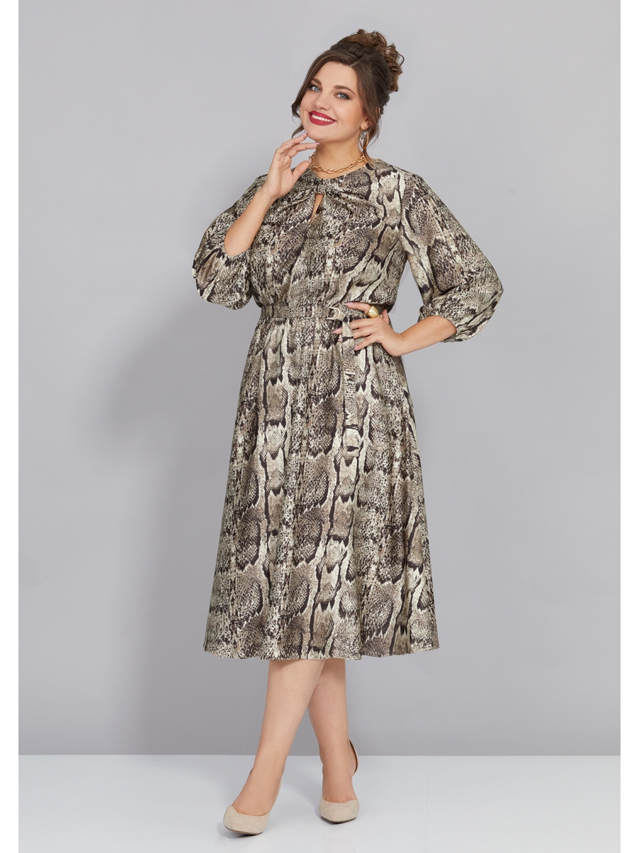 Стильное женское платье полу-прилегающего силуэта, выполнено из принтованного атласа, на трикотажной подкладке. Лиф платья отрезной по линии талии, на талии вставлена резинка для комфорта надевания, также на полочке выполнены вытачки, а по горловине декоративный узел в виде банта. Юбка платья А-образного силуэта, на подкладке, рукав втачной, оптимальной длины, выполнен из основной ткани, по низу присборен на резинку. Спинка идентична полочке, со средним швом и вытачками. В качестве дополнения к платью в комплекте есть пояс выполненный из основной ткани.