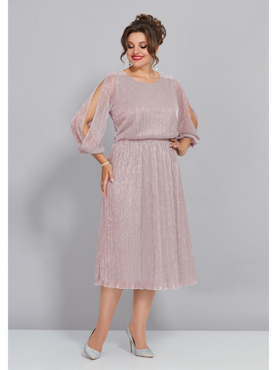 Нарядное женское платье, полу-прилегающего силуэта, выполнено из плиссированной ткани. Горловина платья округой формы, на обтачке, лиф платья отрезной по линии талии, на резинке, что обеспечивает комфортное прилегание по талии. По линии плеча выполнены кокетки из основной ткани и декорированы бусинами. Юбка платья немного расклешенного силуэта, присборена по линии талии. Рукав втачной, с разрезами по середине, низ на манжете. Спинка идентична полочке, все платье на трикотажной подкладке. Легкое, элегантное платье прекрасный выбор для торжественных мероприятий!