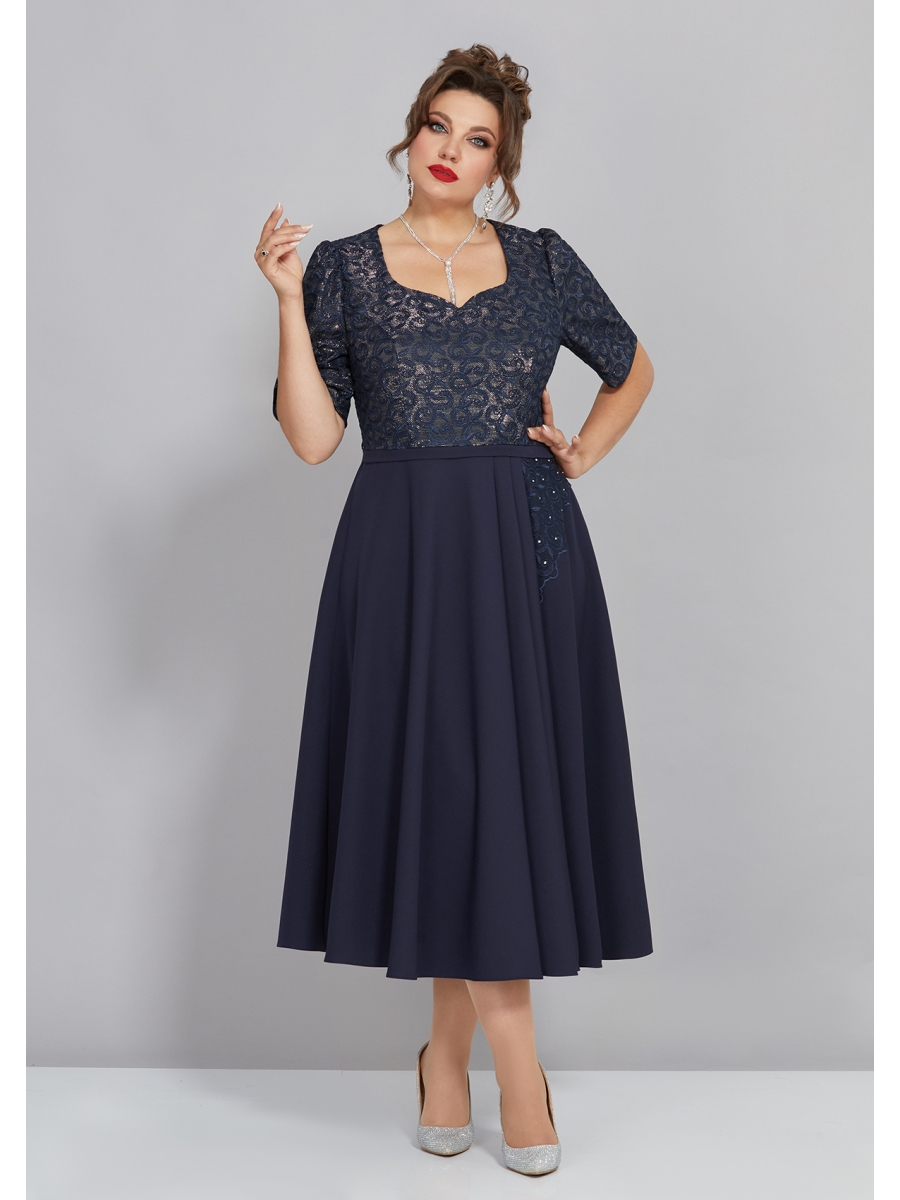 Нарядное женское платье, полу-прилегающего силуэта, выполнено из текстиля и кружева. Лиф платья отрезной по линии талии, выполнен из кружева на подложке из серебра. Горловина платья фигурной формы, на обтачке, также на лифе обработаны рельефы, по линии талии декоративный пояс из однотонной ткани. Рукав втачной, длиной 3/4, выполнен из кружева. Юбка платья расклешенная, с складками по линии талии и аппликацией, декорированной стразами. Спинка идентична полочке, отрезная по линии талии, со средним швом и рельефами, в среднем шве потайная молния.