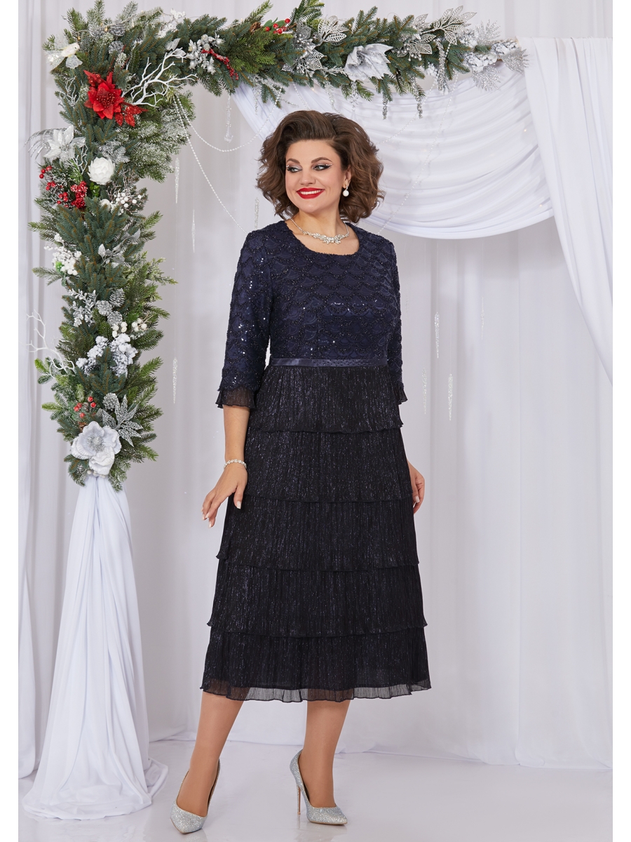 Эффектное женское платье, полу-прилегающего силуэта, выполнено из кружева с подложкой из атласа и плиссированной ткани. Лиф платья отрезной по линии талии, выполнен из кружева, вырез горловины округлой формы, лиф на подкладке из атласа. По линии талии втачной пояс из атласа, декорирован стразами, юбка платья расклешенного силуэта, из плиссированной ткани, состоит из нескольких ярусов, на трикотажной подкладке. Рукав втачной, выполнен из кружева, с подкладкой из атласа, по низу с присборенной плиссировкой. Спинка идентична полочке, лиф отрезной по линии талии, из кружева на атласе, юбка из плиссированной ткани, в несколько ярусов, в боковом шве потайная молния.