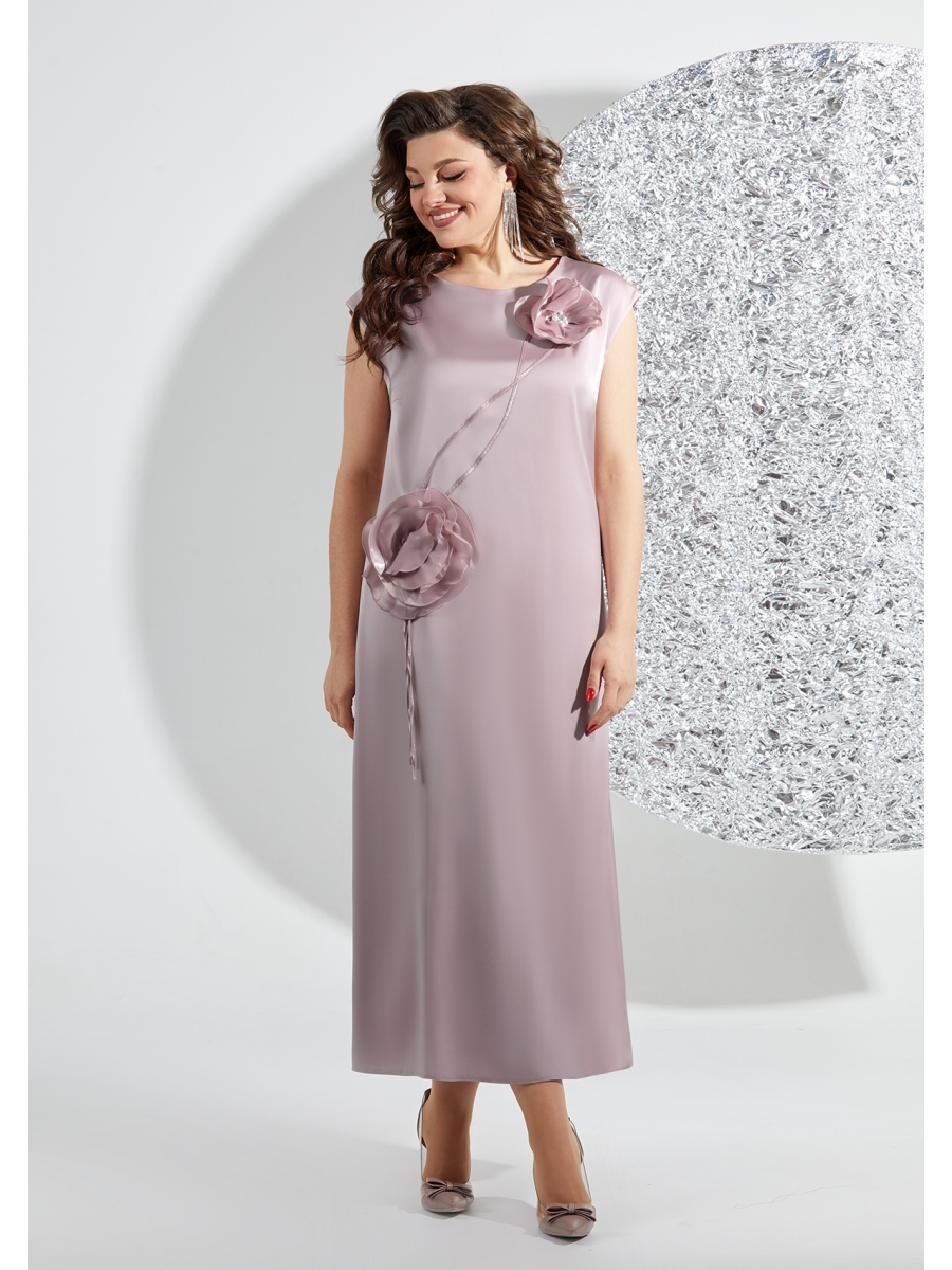 Эффектное, женское платье полу-прилегающего силуэта, выполнено из плотного атласа, на трикотажной подкладке. Горловина округлой формы, обтачена подкладкой, также на полочке выполнены нагрудные вытачки. Спинка со средним швом, в среднем шве потайная молния. Платье декорировано цветами, которое можно снять для удобства ухода за изделием.