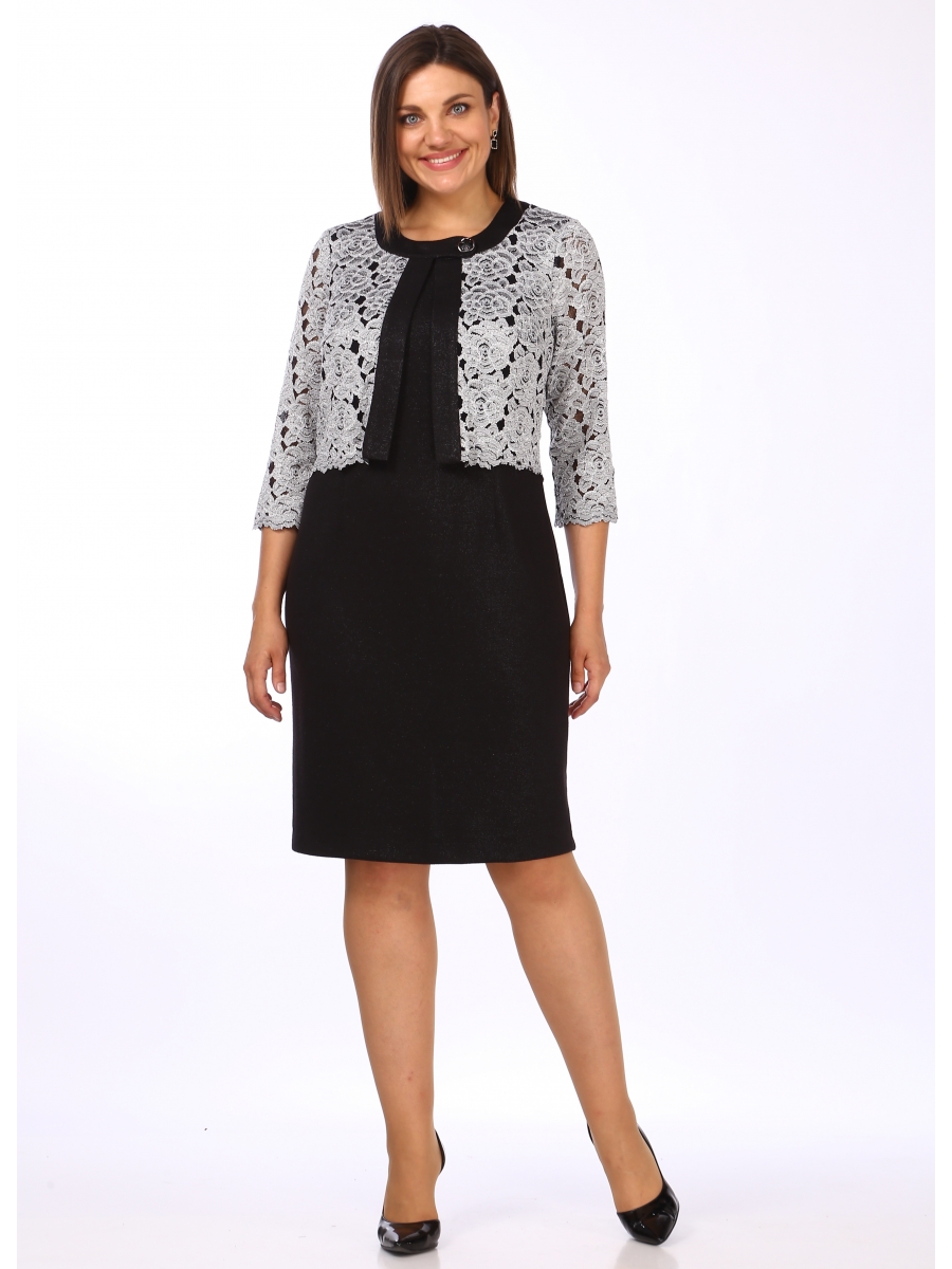 Платье женское, нарядное, полуприлегающего силуэта из трикотажного полотна, длиной чуть ниже линии колена. Перед платья с нагрудными и талиевыми вытачками, с круглым вырезом горловины. Спинка с талиевыми вытачками и средним швом, который заканчивается разрезом. Верхняя часть платья из гипюра, имитация жакета. С нагрудными вытачками, втачным одношовным рукавом длиной 3/4. Горловина обработана отрезными двойными обтачками с застежкой на 1-у петлю и пуговицу. На переде отрезные планки. Обтачки горловины и планки по переду из основного материала.