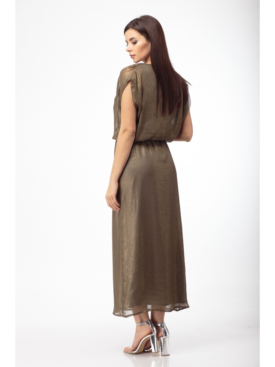 Элегантная роскошь! Нарядное платье из струящегося шифона с напылением под золото. Платье прямого силуэта ниже колена, отрезное по линии талии, пояс на резинке, верхняя часть образует напуск. Линия плеча спущена, а плечевой шов присборен по переду, вырез горловины V-образный.Платье выполнено на подкладке, наряд дополнен декоративным цветком. Романтичный образ, в котором вы будете сиять!