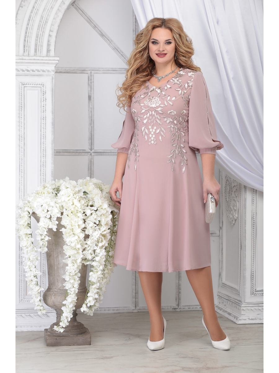 Платье женское, полуприлегающего силуэта, расширенное к низу, на подкладке из дышащей, приятной на ощупь и достаточно эластичной ткани, отрезное по линии талии. Длина платья по среднему шву спинки 106см. На верхнюю часть лифа нашит гипюр нагрудными выточками, переходящий вниз нашивными аппликациями. Рельефы переда выходят из проймы, проходят через центр груди вниз. Рельефы спинки выходят из проймы вниз, в среднем шве обработана застёжка на потайную тесьму молнию. Ниже линии талии на боковых частях горизонтальные подрезы. Расширение низа юбки за счёт отрезных бочков. Горловина углублённая спереди, обтачная, фигурная. Рукава втачные, двухшовные, со сборкой по шву притачивания манжеты с резинкой, длиной 51см. В верхнем шве длинный разрез скреплён 6-ю бусинками. Изделие с плечевыми накладками.