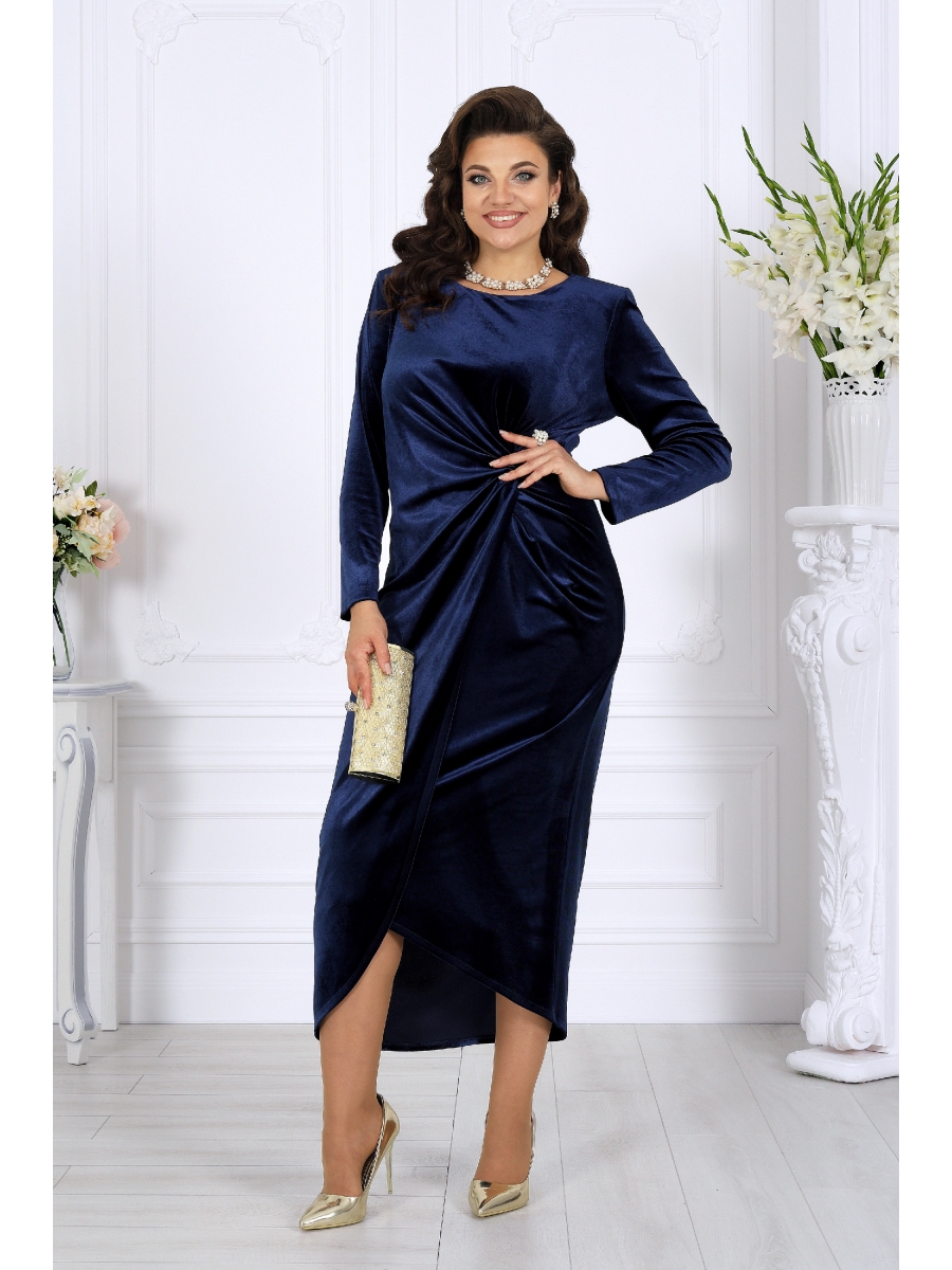 Платье женское прилегающего силуэта, выполнено из трикотажного полотна «велюр». Модель асимметричная, без подкладки, с плечевыми накладками. Перед платья состоит из двух частей перекрученных между собой по линии талии и скрепленных за запах. Перекрут деталей переда образует драпировку. На спинке расположены талиевые вытачки, в среднем шве – застежка на тесьму-«молнию» (50 см). Горловина округлой формы, углубленная спереди. Рукав длинный, втачной. Длина платья – 132 см, длина рукава – 57 см.