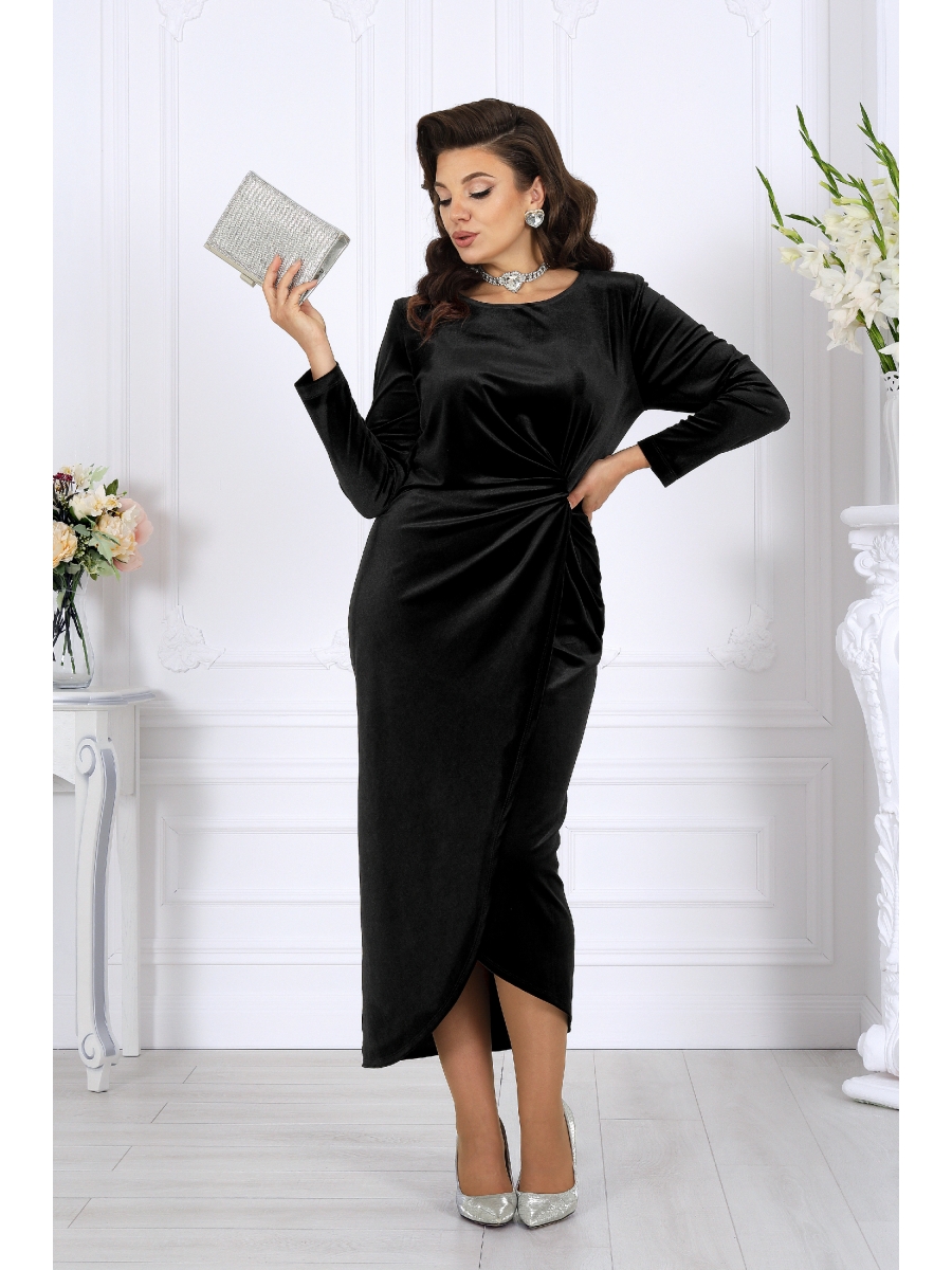 Платье женское прилегающего силуэта, выполнено из трикотажного полотна «велюр». Модель асимметричная, без подкладки, с плечевыми накладками. Перед платья состоит из двух частей перекрученных между собой по линии талии и скрепленных за запах. Перекрут деталей переда образует драпировку. На спинке расположены талиевые вытачки, в среднем шве – застежка на тесьму-«молнию» (50 см). Горловина округлой формы, углубленная спереди. Рукав длинный, втачной. Длина платья – 132 см, длина рукава – 57 см.