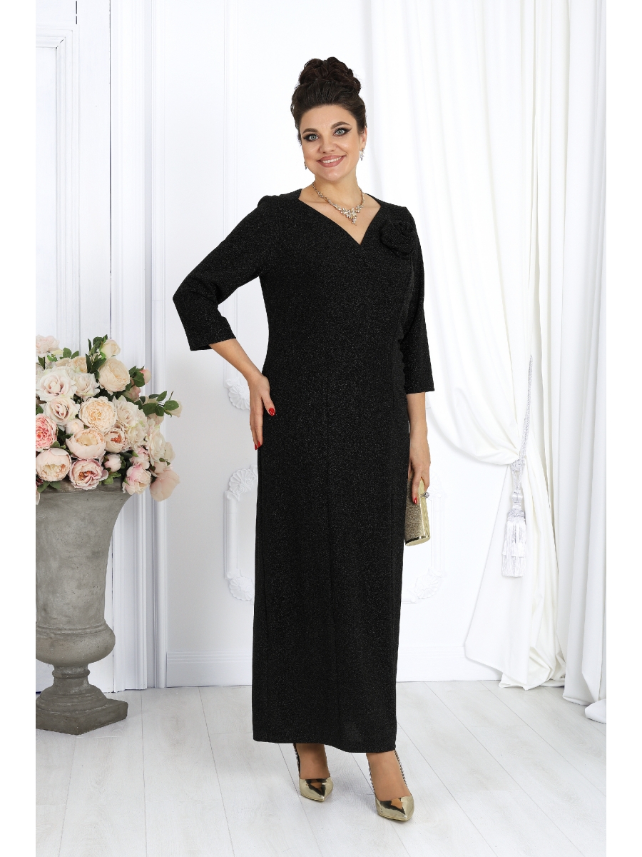 Платье женское полуприлегающего силуэта, выполнено из трикотажного полотна с фактурной лицевой стороной «люрекс». Модель на трикотажной подкладке, без плечевых накладок. Перед с рельефными швами, направленными от пройм до низа; вдоль левого бокового шва, в области талии, перед задрапирован сборкой. Верхняя часть переда выполнена в виде имитации запаха, переходящего в углубленный V-образный вырез горловины. На спинке обработаны талиевые вытачки и средний шов с разрезом в нижней части. Плечевые швы спинки смещены на перед, образуя подрез кокетки, выходящий из угла горловины переда и направленный к пройме. Рукав длиной 3/4, втачной. Платье дополнено съемным «цветком» из основного полотна. Длина платья-130 см; длина рукава-47 см.