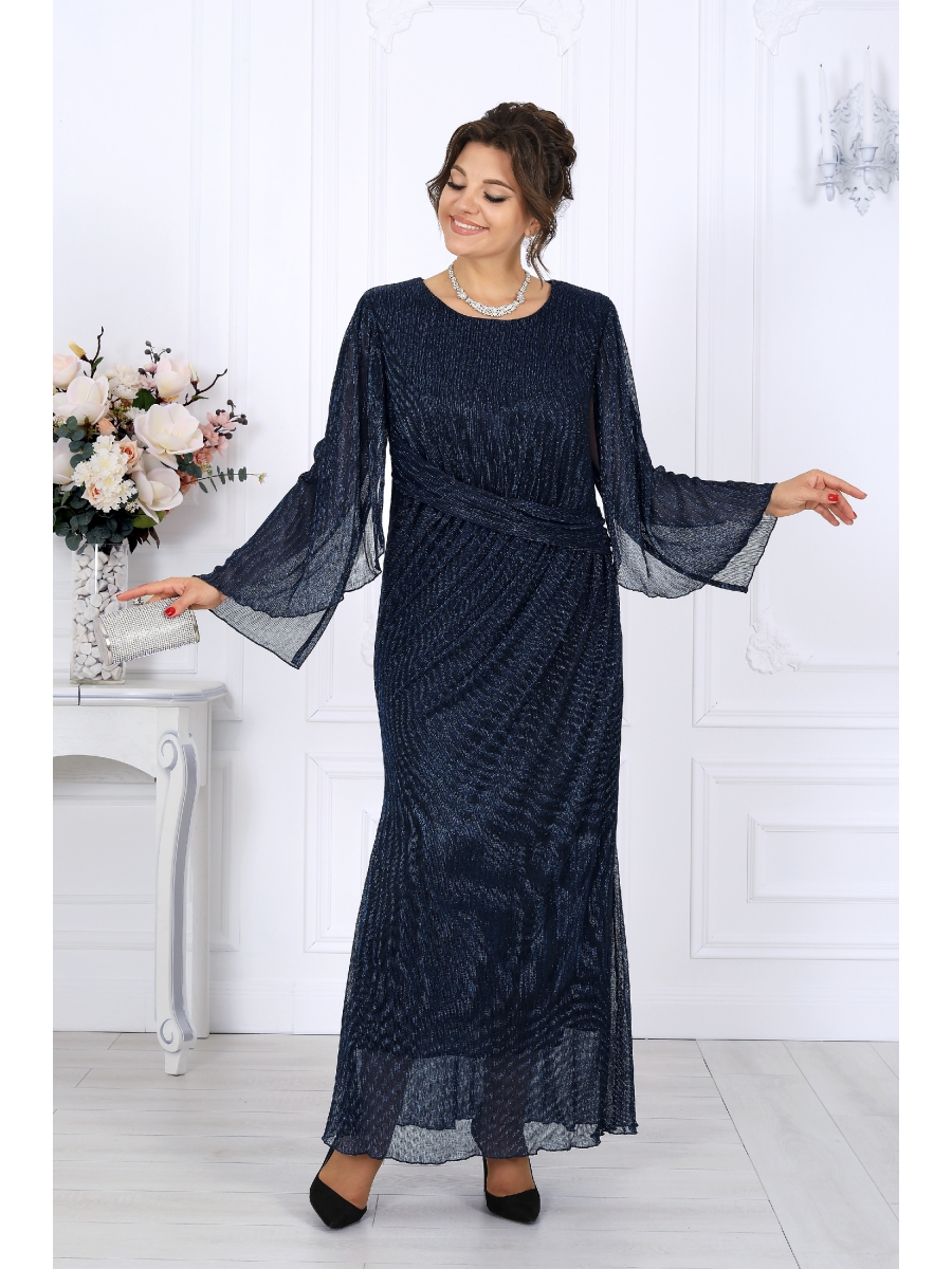 Длинное вечернее платье из элегантной сетки-гофре с нитью люрекс мерцает при каждом движении, словно улавливая в себе отблески огней. Этот деликатный блеск смотрится дорого и изысканно, создавая неповторимый аристократичный образ.