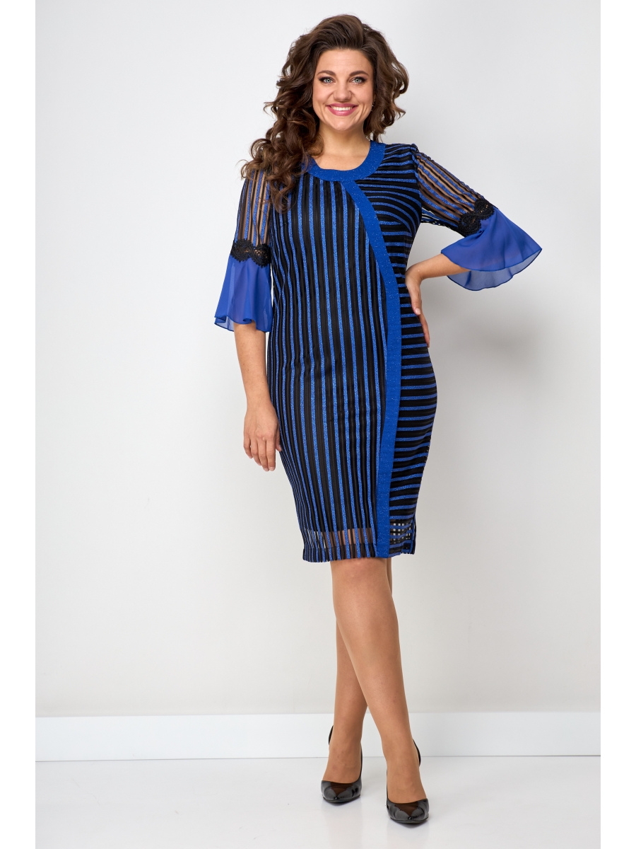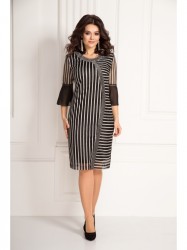 По горловине полочки притачная деталь в цвет платья. Украшением платья служит игра рисунка ткани, в нашем случае это полоска, которая с одной стороны изделия вертикально, а с другой горизонтально и разделена между собой планкой. По полочке нагрудные выточки. Спинка со средним швом. Потайная молния вставлена в средний шов спинки. По спинке две талевые выточки. Для удобства ходьбы по низу шлица. Рукав выполнен из основной ткани и волана из шифона, разделенных между собой кружевом. Длина рукава ниже локтя. Платье на трикотажной подкладке.
