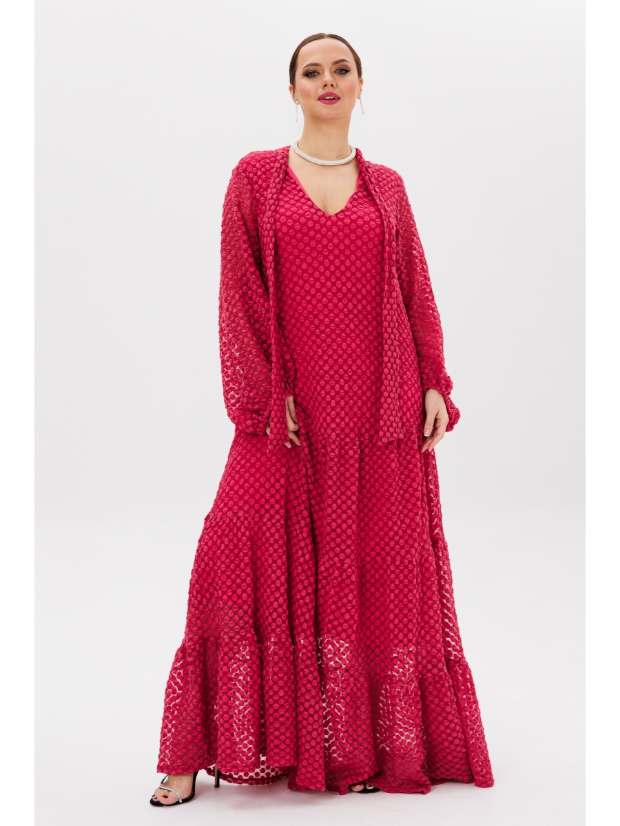 Вечернее платье макси из кружевного полотна, на подкладке, трапециевидного силуэта — дополнение любого образа. Отличный вариан на любое торжество. По горловине V-образный вырез и стойка переходящая в бант. Рукав расширенный к низу, на резинке, фигурный. По полочке и спинке идут 3 присобранных волана.