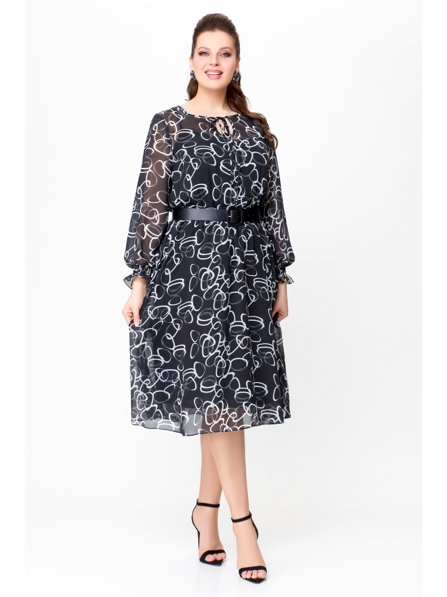 Платье длиной миди, выполнено из шифона на трикотажной подкладке. Лиф отрезной по линии талии. Талия регулируется резинкой. Нижняя часть платья А-силуэта. Подкладка верхней части платья на бретелях. Рукав длинный втачной. По низу рукава - 5 рядов декоративных, эластичных строчек. Горловина округлой формы, по центру переда капелька с завязкой.