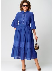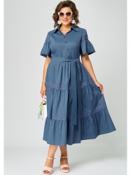 Платье женское нарядно-повседневное полуприлегающего силуэта до талии расширенное к низу. Выполнено из хлопка в сочетании с отделкой из хлопокового шитья. Вырез горловины воротик на стойке рубашечного типа, рукав втачной с отделочными вставками из шитья, расширенный к низу за счет встречных складок. По талии и по нижнему волану юбки сборка и отделочная вставка из шитья. По верхней части спинки фигурная кокетка из шитья. Застежка до талии на обметанные петли и пуговицы. Декором платья служит съемнй пояс из основной ткани.