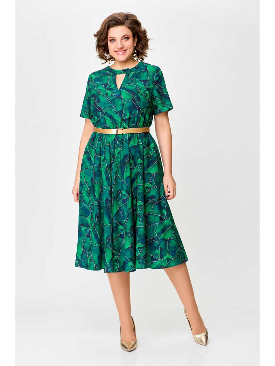 Платье из тонкого текстиля Х-образного силуэта, отрезное по линии талии. По переду лифа обработаны нагрудные вытачки, удлинённый V-образный вырез и отрезанная декоративная кокетка с застёжкой на кнопку. Спинка лифа цельнокроеная. Юбка расклешённая с карманами в боковых швах. Рукав короткий. По талии платье собрано на эластичную тесьму. В комплекте ремень.