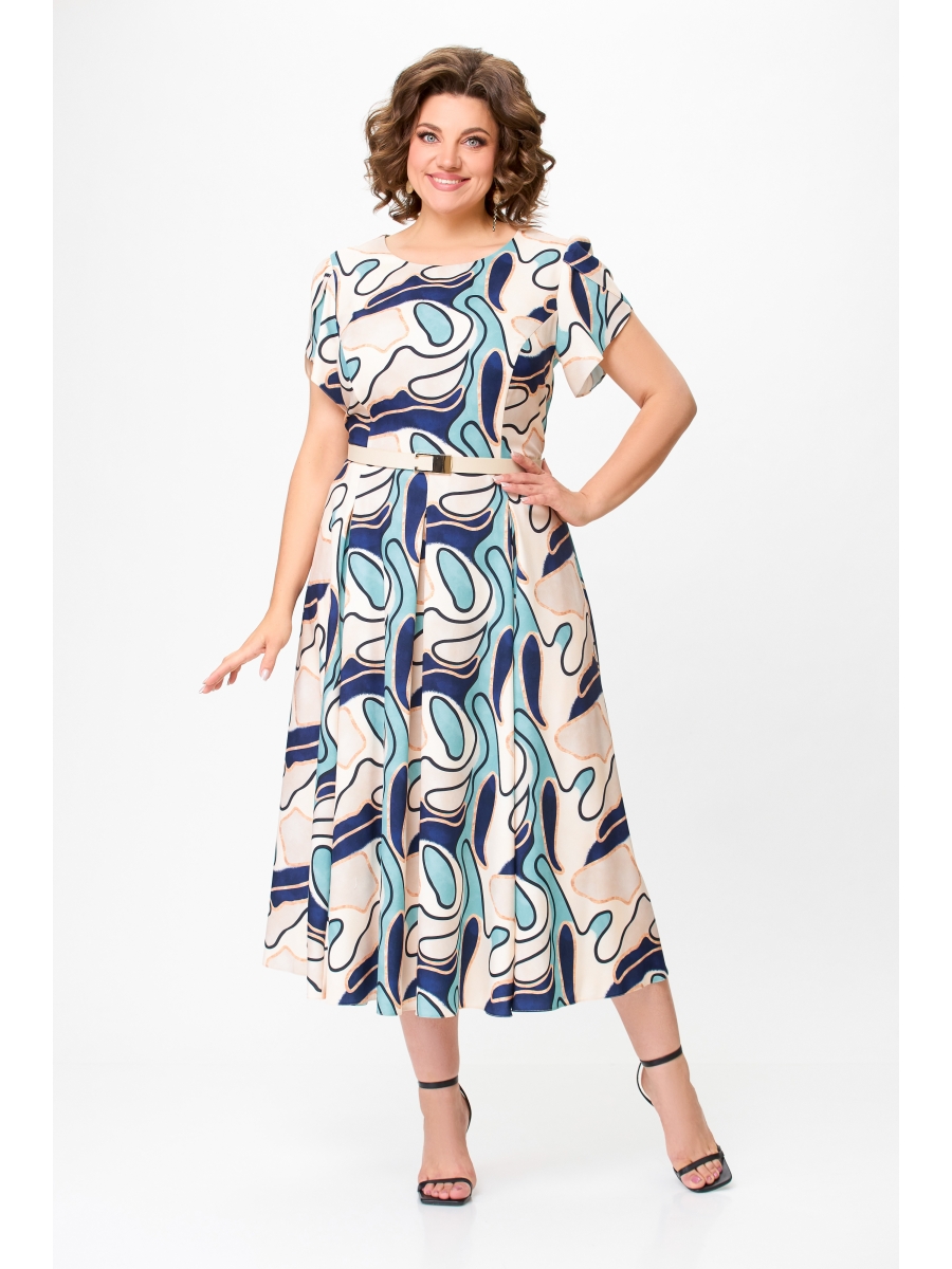 Платье из текстиля прилегающего силуэта. Платье отрезное по линии талии. По переду и спинке лифа расположены рельефы. Юбка расклешенная из шести клиньев со встречными складками по линии талии. В среднем шве спинки предусмотрена молния. Рукав втачной покроя тюльпан.