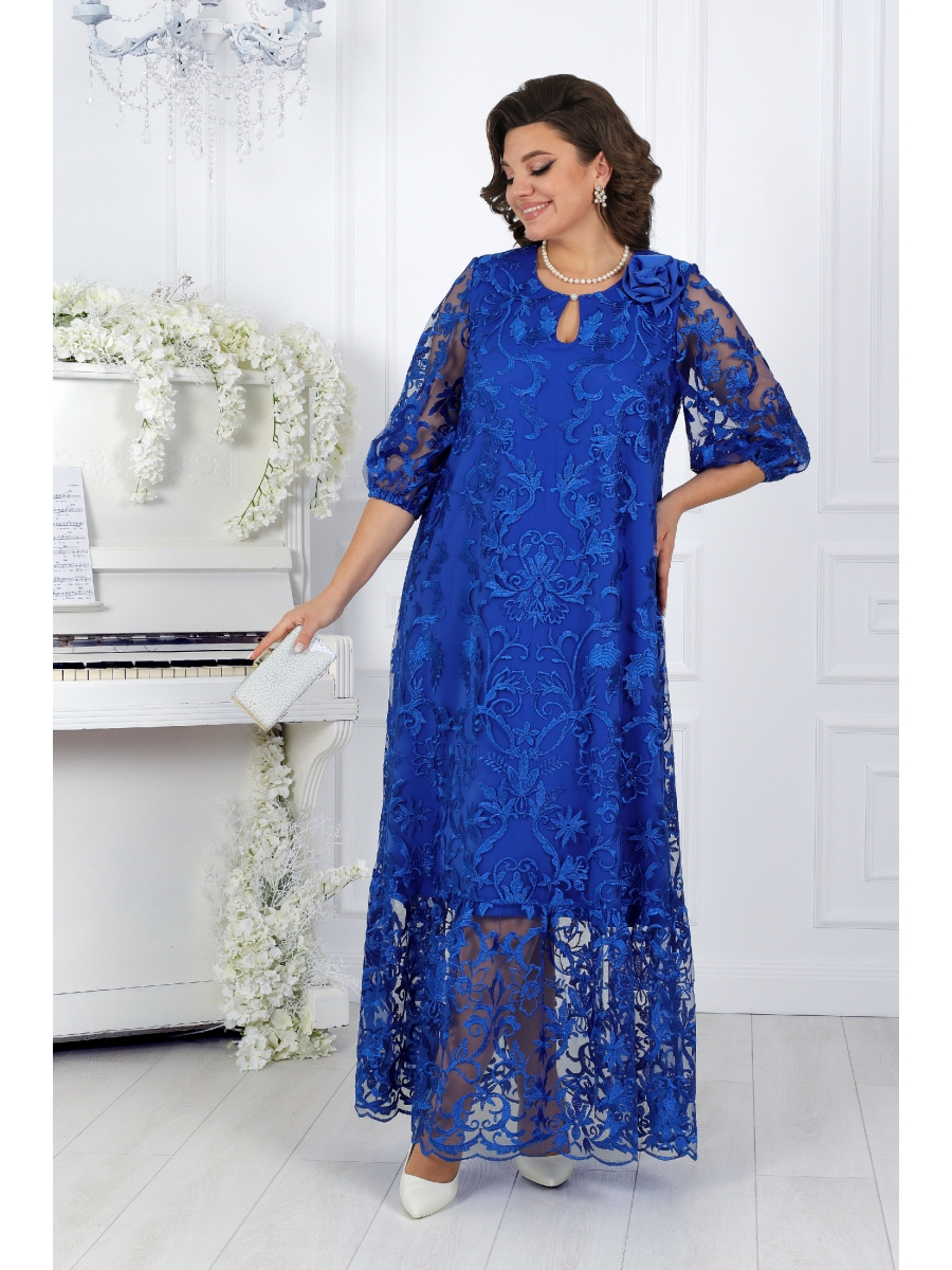 Платье женское, свободного силуэта, расклешенное к низу, выполнено из гипюра и плательной ткани "сатин". Перед и спинка платья двухслойные: верхний слой из гипюра, нижний - из "сатина", с притачным по низу, присборенным воланом в верхнем слое. Длина по среднему шву спинки 137 см. Перед платья, в верхнем и нижнем слое, с нагрудными вытачками, выходящими из пройм, со съемным декоративным цветком "роза" из "сатина". Спинка в верхнем и нижнем слое со средним швом. Горловина переда и спинки обтачная, округлая, по переду углубленная, с декоративно – фигурным обтачным разрезом "капля", соединенная пришивной бусиной. Рукава втачные, одношовные, из гипюра, со сборкой на резинку по низу рукава. Длина рукавов 48 см. Платье с плечевыми накладками, со съемным поясом из "сатина".