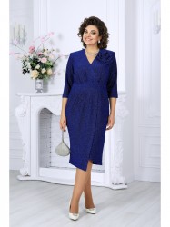 Платье женское полуприлегающего силуэта, выполнено из трикотажного полотна с фактурной лицевой стороной «люрекс». Модель на трикотажной подкладке, с плечевыми накладками. На правой части переда, вдоль отрезного пояса, заложены косые односторонние складки; детали лифа и юбки скреплены на запах. Низ платья асимметричный: правая часть переда удлинена к центру и оформлена углом, левая -- скругленная и входит в правый боковой шов. На спинке обработаны талиевые вытачки. В левом боковом шве предусмотрена застежка на потайную тесьму-«молнию» (35 см). Рукав длиной 3/4, втачной. Платье дополнено съемным «цветком» из основного полотна. Длина платья-108 см; длина рукава-41 см.