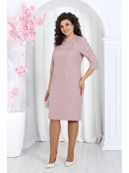 Платье женское полуприлегающего силуэта, выполнено из костюмно-плательной ткани. Модель на трикотажной подкладке, с плечевыми накладками. Перед с рельефными швами, направленными от кокетки до низа. Спинка с рельефами, выходящими из проймы вниз; в среднем шве обработана шлица и застежка на тесьму-«молнию» (50 см). Горловина округлая, спереди углублённая. Рукав длиной 3/4, втачной. Перед, спинка и рукава платья декорированы несколькими цветочными аппликациями, расшитыми бусинами. Длина платья-107 см, длина рукава-43 см.