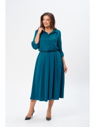 Платье женское свободного покроя из вискозной ткани, отрезное по линии талии (собрано на эластичную тесьму), юбка клешёная. По переду по центру застёжка на петли-пуговицы; спереди кокетка и встречная складка. По лифу спинки кокетка с небольшой сборкой. Воротник рубашечного типа на стойке. Рукав втачной 3/4 на манжете с пуговицей.