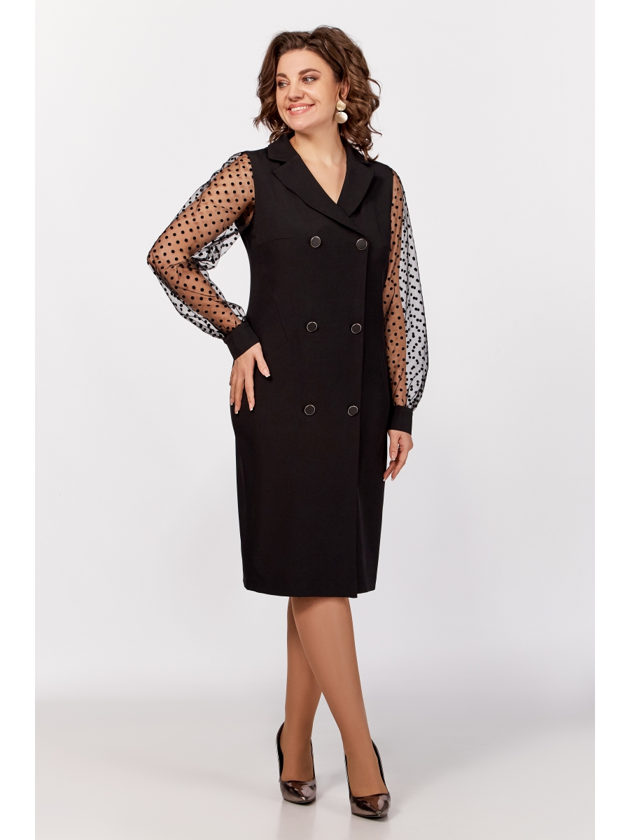Нарядное платье из поливискозной ткани, полуприлегающего силуэта. Спереди имитация двубортной застёжки с декоративными пуговицами в два ряда. Полочки с фигурными бочками и нагрудными выточками. Спинка с центральным швом и талиевыми выточками. Горловина V-образной формы с отложными лацканами и воротником пиджачного типа. Рукав втачной длинный из отделочной ткани «сетка», по низу со сборкой и манжетой из основной ткани, застёгивающейся на петлю и декоративную пуговицу. В боковом шве застёжка на потайную тесьму-молнию.