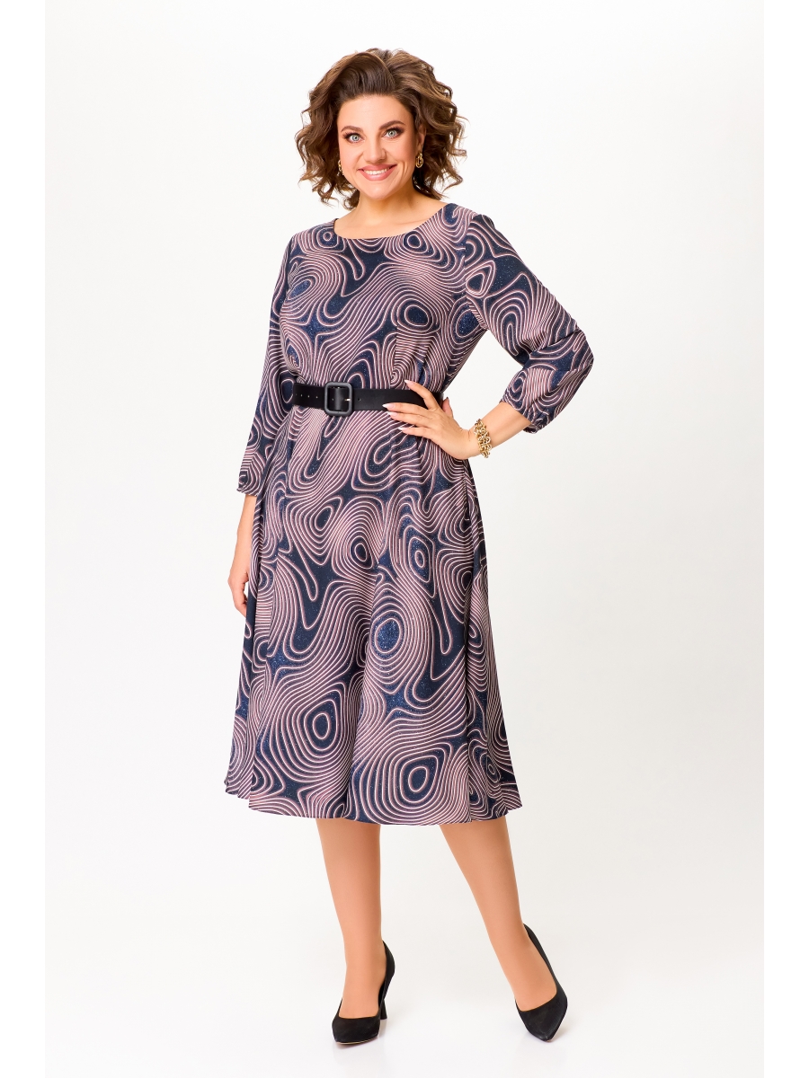Платье из мягкой вискозной ткани, Х-образного силуэта, отрезное по линии талии. Перед и спинка лифа с талиевыми вытачками. Юбка расклешённая с карманами в боковых швах. В среднем шве спинки застёжка на потайную тесьму молнию. Горловина округлой формы, рукав втачной длиной 4/5, по низу собран на эластичную тесьму-резинку.
