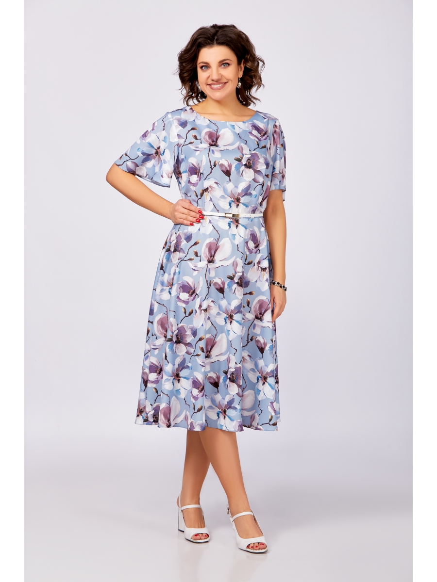 Платье из мягкой вискозной ткани, X-образного силуэта, отрезное по линии талии. Перед лифа с талиевыми вытачками, спинка лифа с центральным швом и талиевыми вытачками. Юбка расклешённая с карманами в боковых швах. Горловина округлой формы. Рукав втачной, короткий, формы «колокол».