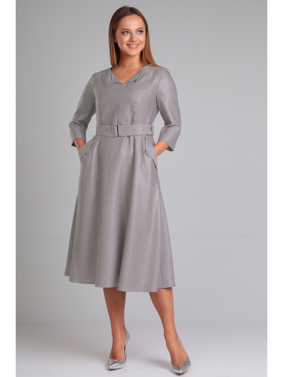 Платье полуприлегающего силуэта, отрезное по линии талии. Горловина с фигурным вырезом, обработана обтачкой. По переду лифа - рельефные швы. По спинке лифа талиевые вытачки и средний шов, в котором обработана потайная молния. Юбка платья "клеш". Рукав втачной прямой, длиной 3/4. В комплекте к платью прилагается съемный пояс.
