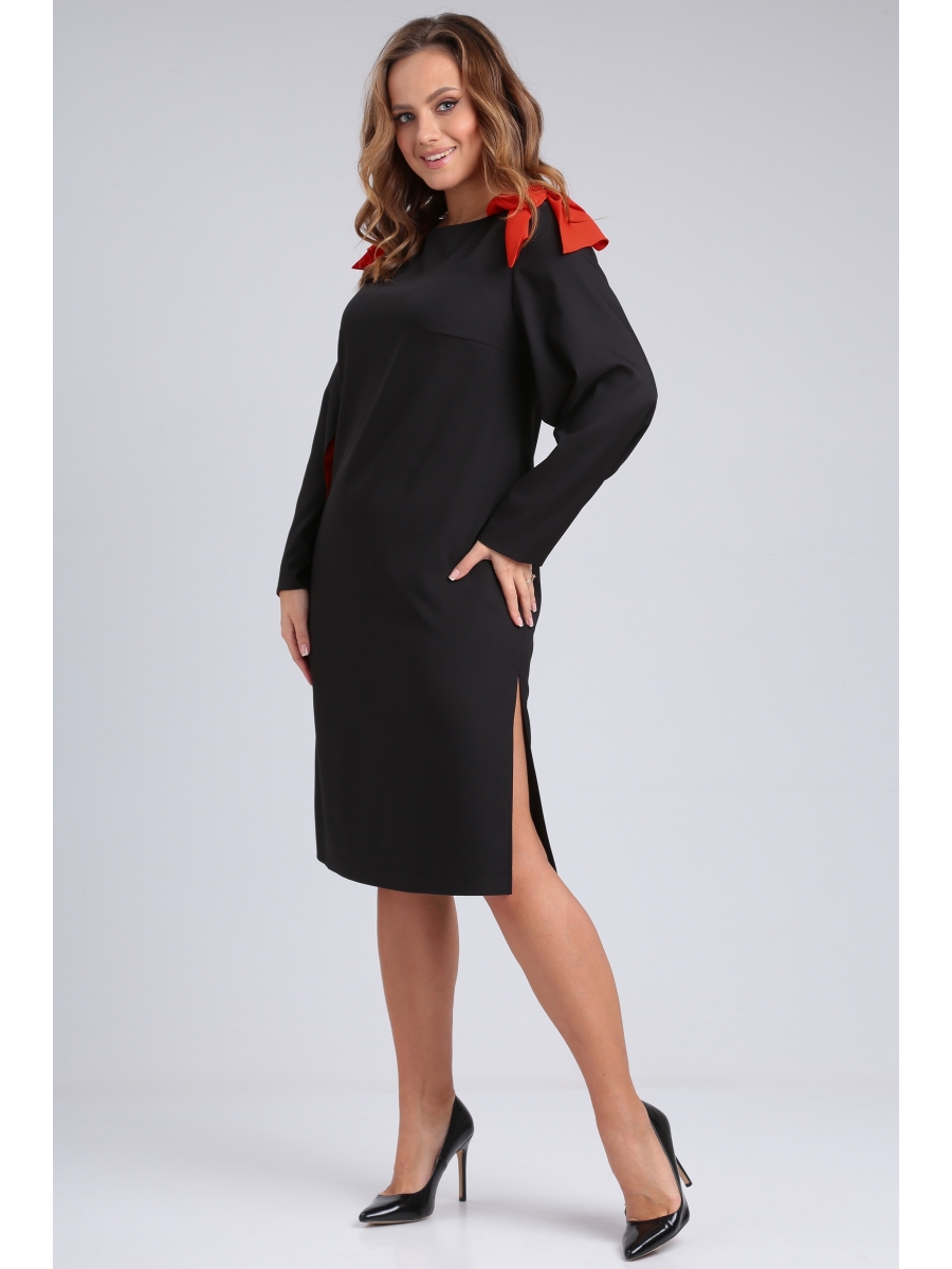 Платье женское полуприлегающего силуэта из костюмно-плательной ткани. Горловина округлой формы. Перед с нагрудными вытачками. Спинка с талиевыми вытачками и застежкой на молнию в среднем шве. Рукав втачной длинный с разрезом, по низу рукава декоративная застежка на петли и пуговицы. По низу платья в боковом шве высокий разрез. Платье по плечам декорировано эффектными контрастными бантами.