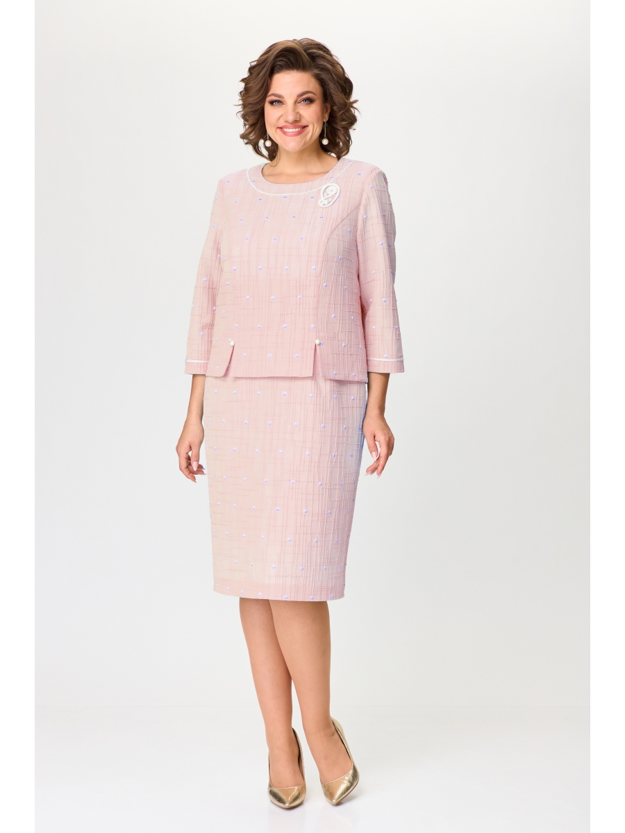 Элегантное женское платье выполнено из жаккарда. Платье имитация двойки. Лиф полуприлегающего силуэта с рельефными швами, внизу рельефа - разрез с бусиной, горловина круглая с отделкой декоративным шнуром, рукава втачные, с отделкой - шнуром по низу. Юбка прямого силуэта, спинка с центральным швом, по низу разрез. Платье на подкладке.