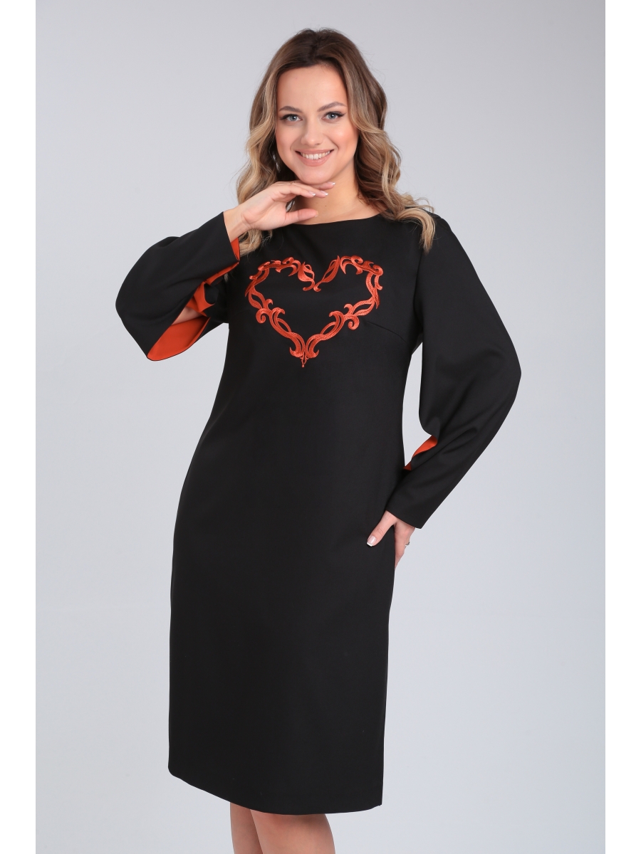 Платье женское полуприлегающего силуэта из костюмно-плательной ткани. Горловина округлой формы. Перед с нагрудными вытачками и декоративной вышивкой. Спинка с талиевыми вытачками и застежкой на молнию в среднем шве. Рукав втачной длинный с разрезом, придающий особенную изысканность и шарм, по низу рукава декоративная застежка на петли и пуговицы. По низу платья в боковом шве - разрез.