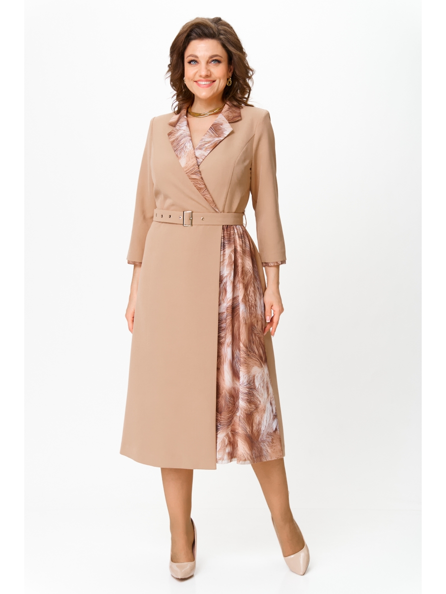 Платье с имитацией запаха, воротник и лацканы с отделкой из сетки. Юбка с левой стороны выполнена из сетки на подкладке. Рукава втачные, длина 3/4, по низу с отделкой из сетки. Платье без подкладки.