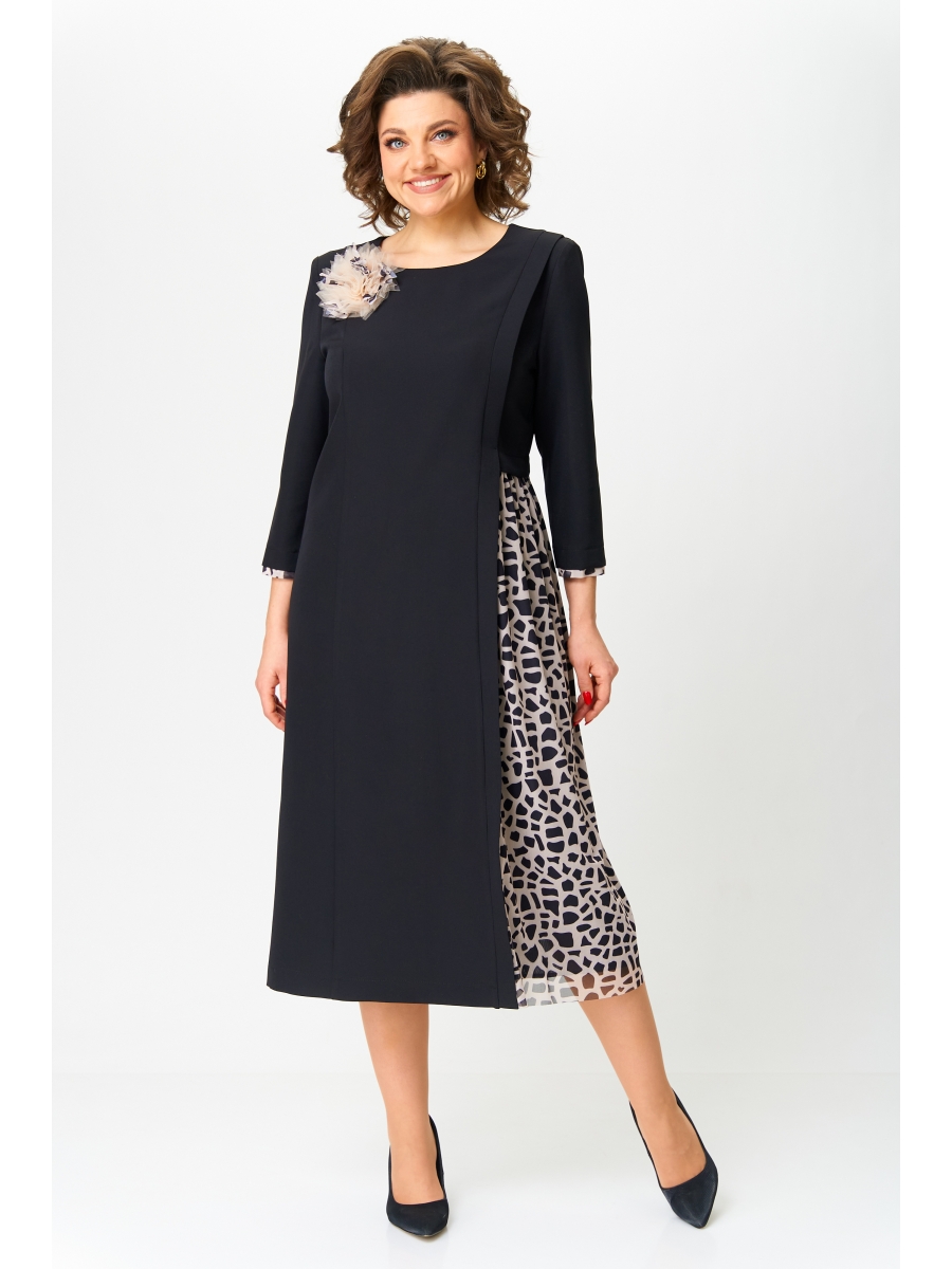 Элегантное женское платье, полуприлегающего силуэта. Горловина круглая, по переду и спинке рельефные швы, с левой стороны в швы вставлена планка, юбка от планки до планки выполнена из сетки на подкладке. Застежка на тесьму молния в среднем шве спинки. Рукава втачные, длина 3/4, по низу рукава отделка из сетки.