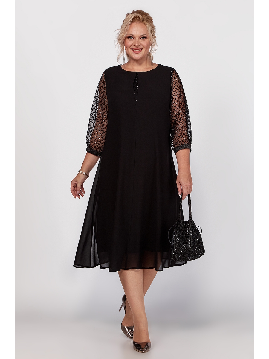 Эффектное шифоновое женское платье А–силуэта. Подкладка изделия выполнена из ткани " масло". Этот праздничный, но в то же время элегантный наряд из воздушной ткани украшен рукавами из сетки с блестящим напылением в виде страз и способен подчеркнуть индивидуальность и благородство своей обладательницы. На полочке по среднему шву обработана имитация капельки со вставкой из сетки. На спинке обработана капелька на навесную петлю и пуговицу. По боковым швам верхнего платья из шифона обработаны высокие разрезы. По низу рукава пришита декоративная резинка. Такое замечательное нарядное черное платье способно стать незаменимым элементом в гардеробе современной модницы. Силуэт платья прекрасно скрывает нюансы фигуры и подчеркивает достоинства. Это платье будет уместно на свадьбе подруги, дне рождения, корпоративе и вечеринке, а также на фотосессии, школьном выпускном балу, вечерней прогулке с друзьями, для домашнего романтичного ужина или свидания.
