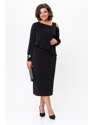 Платье из трикотажного полотна с легким люрексом, с асимметричным вырезом горловины и асимметричным подрезом по линии ниже талии. Верхняя часть платья на подкладке, с напуском по переду и спинке. Рукав длинный. Шлейка по левому плечу выполнена из основной ткани.