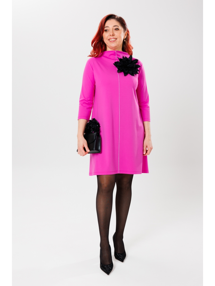 Нарядное женское платье А-образного силуэта, выполненное из трикотажного полотна с легким ненавязчивым блеском. Перед с центральным швом и декоративным кантом. Горловина оформлена цельновыкроенной стойкой. Рукав втачной, одношовный. Украшает платье съемный декор. Платье без карманов и без подкладки.