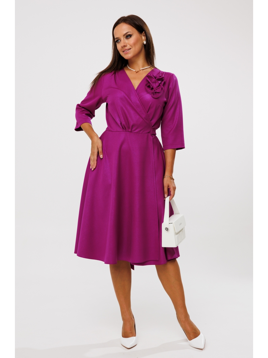 Оформить заказ →Нарядное женское платье, выполненное из плательной ткани с небольшим блеском (тянется). Платье отрезное по линии талии, присборенное на резинку, распашное. Платье фиксируется поясом из основной ткани. Верхняя часть платья с запахом, по плечевым швам и подрезу талии - мягкие декоративные складки. Горловина V-образной формы, обработана окантовкой. Рукава втачные, одношовне, длиной ¾. Нижняя часть платья покроя – полусолнце. Платье декорировано съемным цветком. Платье без подкладки.