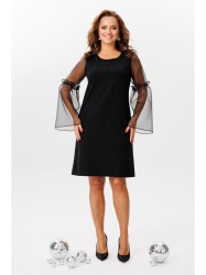 Оформить заказ →Нарядное платье, выполненное из двух видов ткани: крепа с тоненькой нитью люрекса на трикотажной основе (тянется) и органзы (не тянется). Платье А-силуэта. Спинка со средним швом. Горловина округлой формы, обработана окантовкой. Рукава втачные, одношовные, отрезные выше линии локтя, нижняя часть присборена, имитируя рюшу. Платье без подкладки.