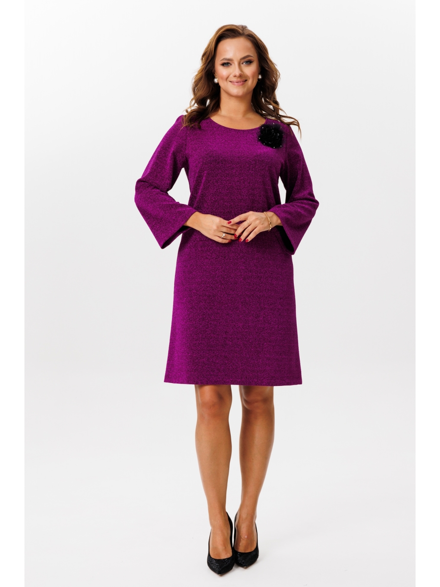 Нарядное платье, выполненное из крепа на трикотажной основе с тоненькой нитью люреска (тянется). Платье А-силуэта. Спинка со средним швом. Горловина округлой формы, обработана окантовкой. Рукава втачные, одношовные, расширенные к низу. Платье декорировано съемным цветком на булавке (цветок может отличаться от фото). Платье без подкладки.