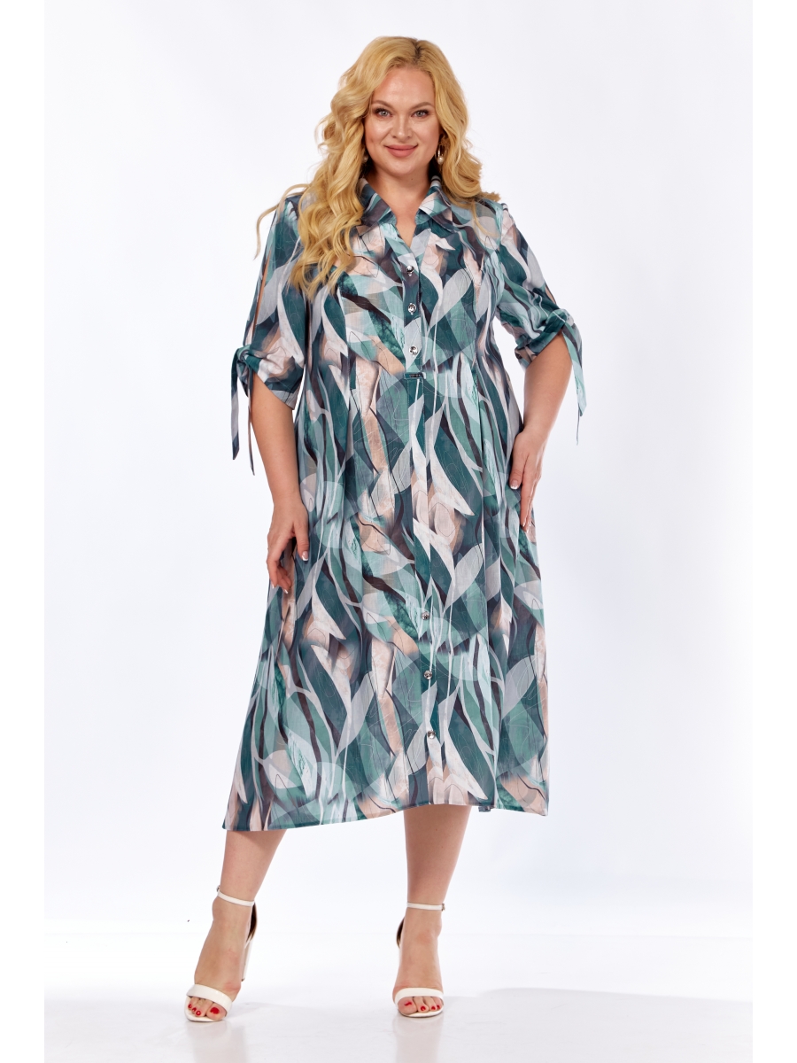 Элегантное платье свободного кроя, выполненное из хлопковой ткани с дизайнерским принтом, станет неотъемлемой частью Вашего гардероба в повседневной жизни и в нарядных образах. На переде обработаны рельефные швы из пройм, переходящие в складки на уровне талии, функциональная застёжка-планка на 3 петли и пуговицы, а также вертикальная настрочная планка по центру, снизу декорированная пуговицами. Спинка с подрезом и выходящей из-под него встречной складкой. В боковых швах обработаны разрезы. Низ изделия разноуровневый(низ переда с плавным прогибом). Рукав втачной, длиной чуть ниже локтя, с декоративным вырезом и завязывающейся патой. Воротник стояче-отложной со стойкой.