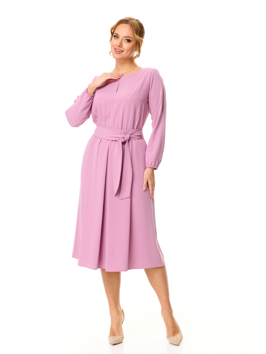 Элегантное женственное платье длины midi из струящейся нарядной ткани. Платье отрезное по талии, застежка по горловине спинки. Лиф с нагрудными вытачками и декоративным разрезом «капелька». Юбка со складками. Рукав втачной длинный, c разрезами «капелька» по центру. Низ собран на эластичную тесьму. Пояс съемный длинный. Платье без подкладки.