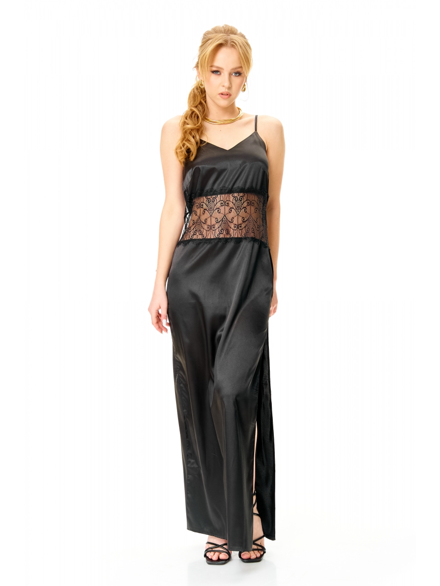 Платье в стиле «old Money» в идеальном черном. Платье из непрозрачного атласа на тонких регулируемых бретелях. Слегка прилегающего силуэта, спинка прямая. Без застежки. По талии широкое кружево. Высокие разрезы по бокам.