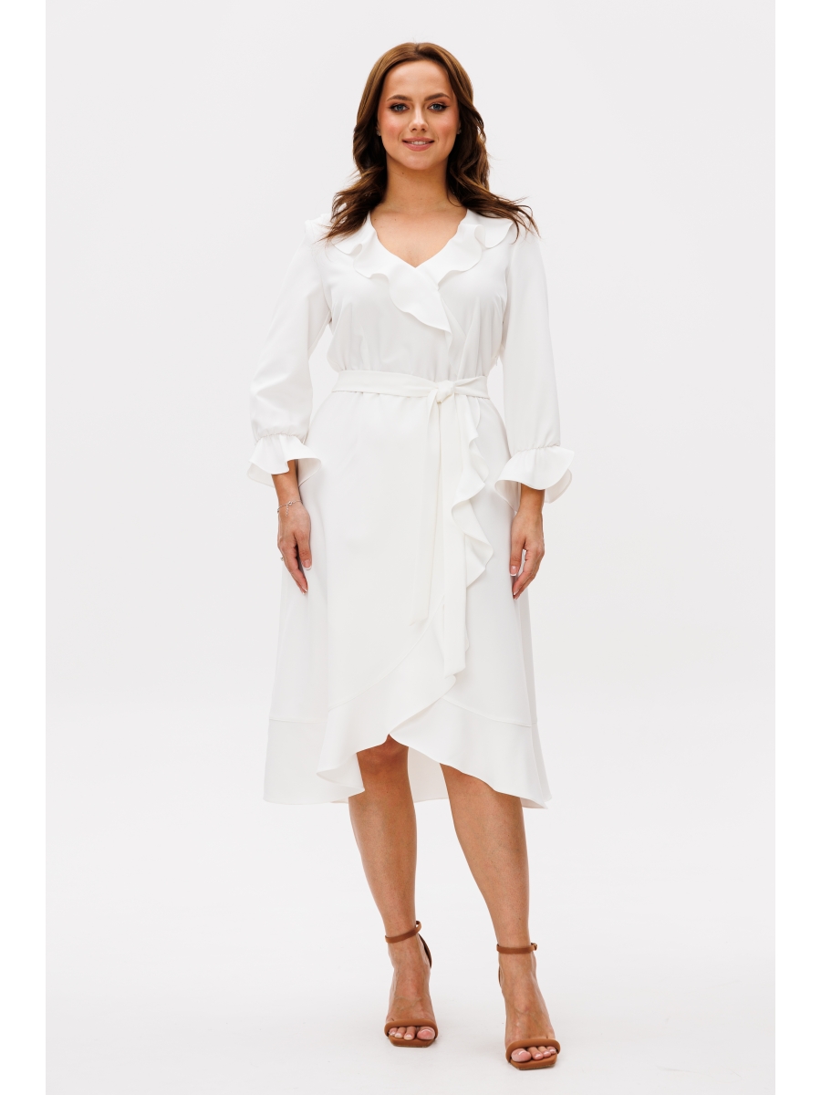 Эффектное платье из плотной непрозрачной ткани с воланами. Платье полуприлегающего силуэта, отрезное по талии. Застегивается на молнию с боку. Юбка с имитацией запаха, по которой проходит волан. Углубленная V-образная горловина прячется в воланах. Рукав втачной, по низу волан со сборкой на резинку. Платье без подкладки. Пояс съемный.
