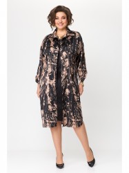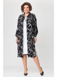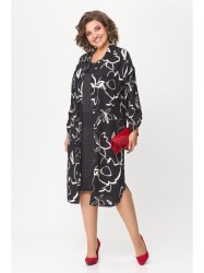 Платье состоит из удлинённой рубашки с отложным воротником. По передней части планка, застежка-пуговицы. Свободный крой, по бокам фигурные подрезы. Вторая деталь этого наряда - имитация платья. То есть передняя часть платья однотонного черного цвета вшита по боковым швам в саму рубашку и создается впечатление, что наряд двухпредметный. В расстёгнутом виде смотрится как платье и поверх надета рубашка. Однотонная часть платья выполнена из мягкой и приятной ткани. Ткань цветная на вид как плотный атлас.