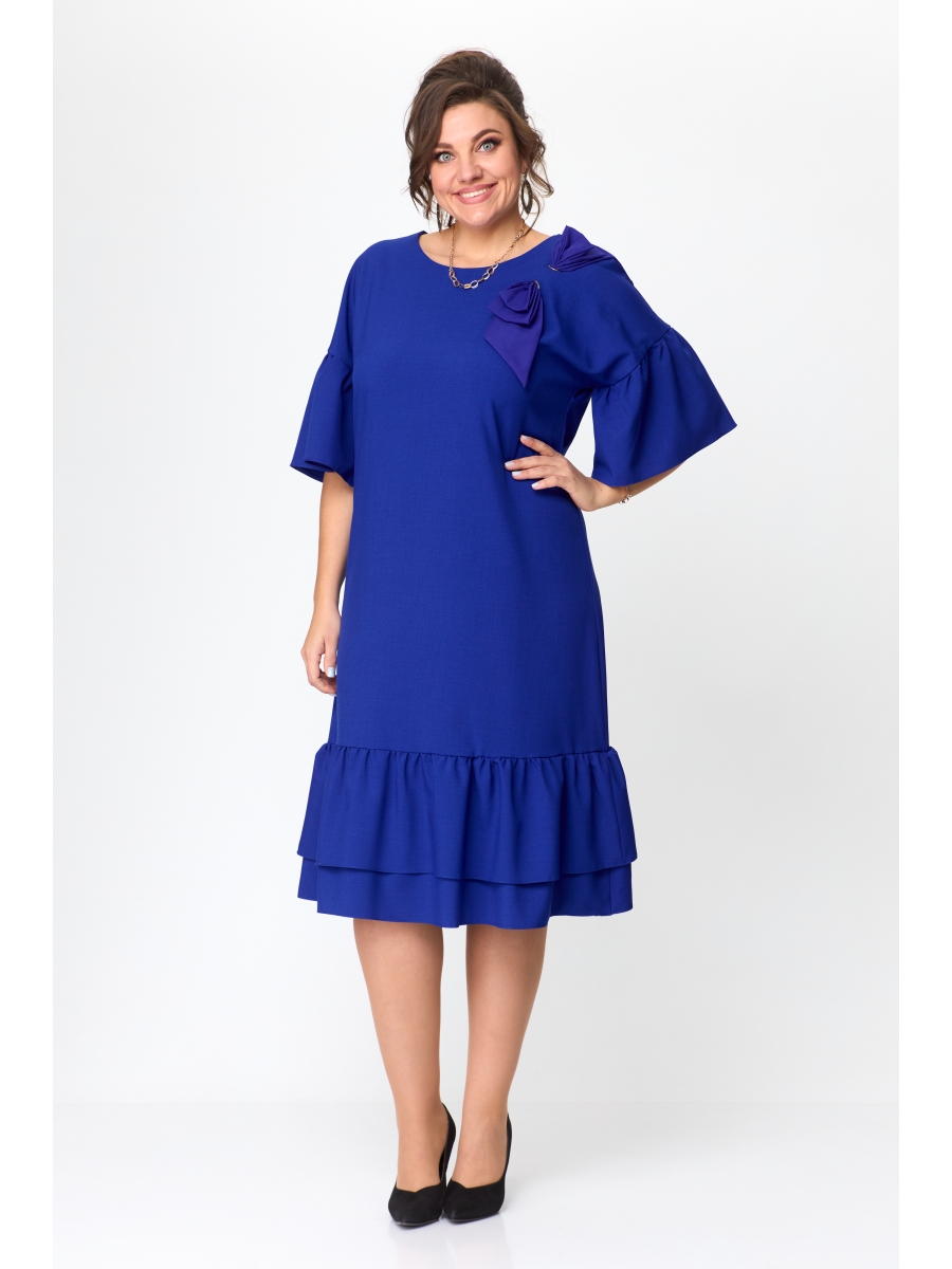 Платье свободного кроя. Линия плеча спущенная, без вытачек. Горловина полукруглая, рукав 3/4. По нижней линии рукава волан, низ изделия заканчивается двумя воланами. Длина изделия ниже колена. Визитной карточкой данной модели является красивый нарядный бант, который продет через два люверса. Бант съемный, платье просто с люверсами также хорошо смотрится.