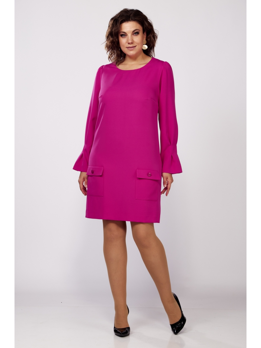 Платье А-силуэта из плательного полотна (немного тянется), без подкладки. Перед с нагрудными вытачками и накладными карманами. Спинка со средним швом и застежкой на навесную петлю-пуговицу. Рукава втачные, одношовные со сборкой по окату и двумя защипами по низу.