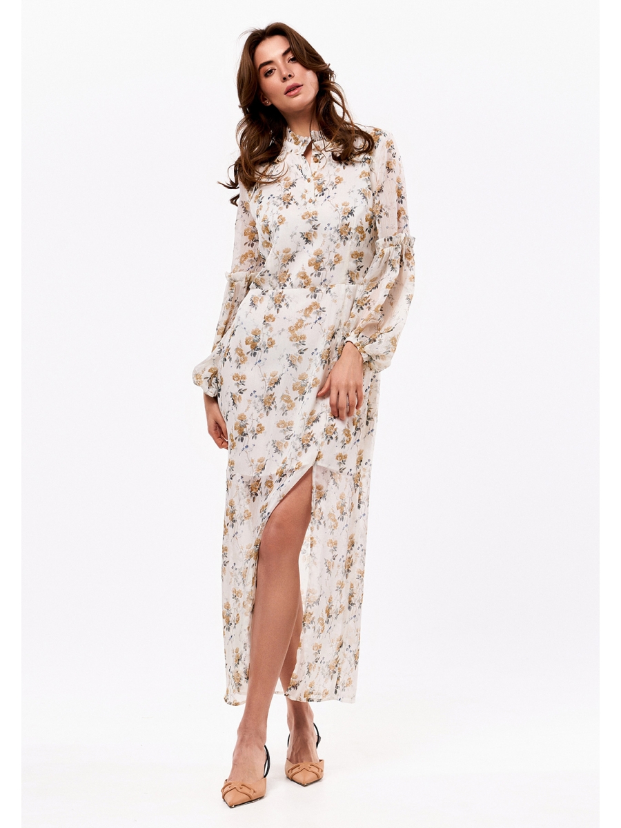 Оформить заказ →Платье женское прилегающего силуэта. Лиф переда с нагрудными и талиевыми вытачками. Из середины горловины до середины проймы переда проходят фигурные кокетки с притачными рюшами. Лиф спинки с талиевыми вытачками. Передняя и задняя часть юбки с талиевыми вытачками. По переду с левой стороны находится рельеф, который переходит в разрез до линии колена. Рукав втачной, состоит из двух частей, которые разделяет рюша на сборке. Верхняя часть рукава малого объема выше линии локтя. Нижняя часть рукава большого объема сверху на сборке. Низ рукава с притачным манжетом на резинке. Рукав длиной до линии запястья. Воротник стойка с притачной рюшей. Застежка сбоку на потайную тесьму «молнию», а также на притачную планку по переду с прорезными петлями и пуговицами. Платье длиной макси.